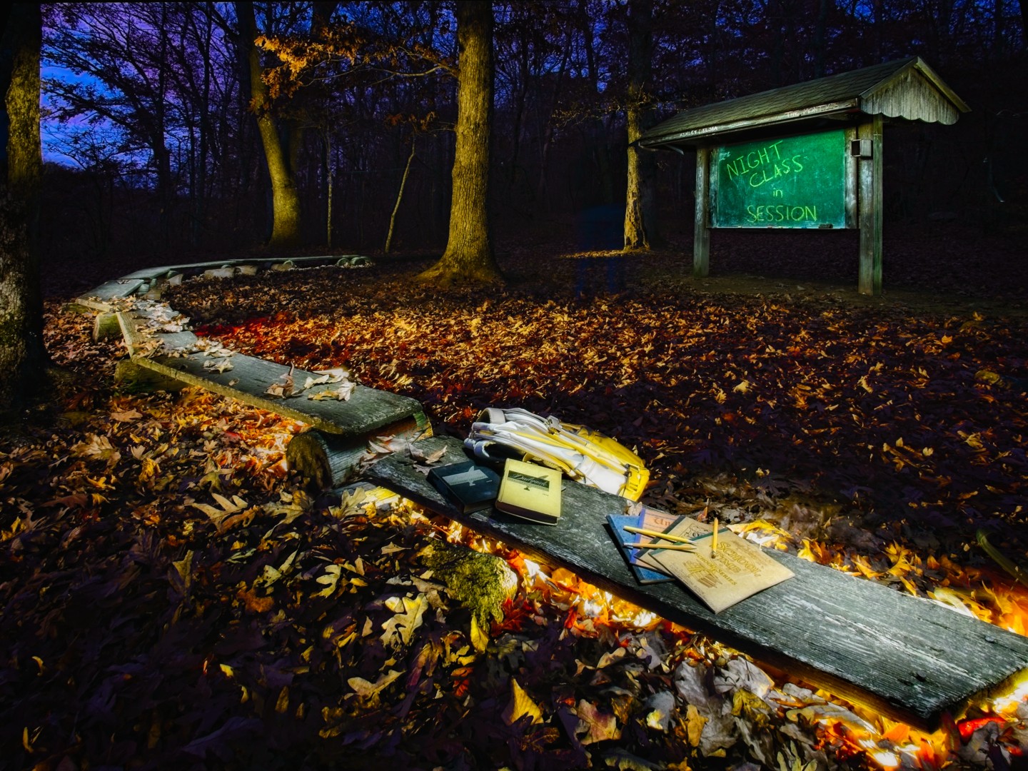 Here is one a little different. I have been working on “light” painting scenes after dark. I thought the classroom area in Hartman Park, would be a tongue-n-cheek attempt at using this technique and implying a night class was in session. This method is created by using 12-15 images blended together, after using a flashlight to illuminate elements.
